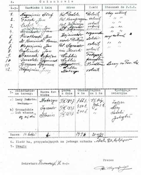 Pierwsza strona z zachowanego protokołu zebrania organizacyjnego koła myśliwych w Matczynie w dniu 15 czerwca 1947 r. W zebraniu uczestniczyło 21 osób.